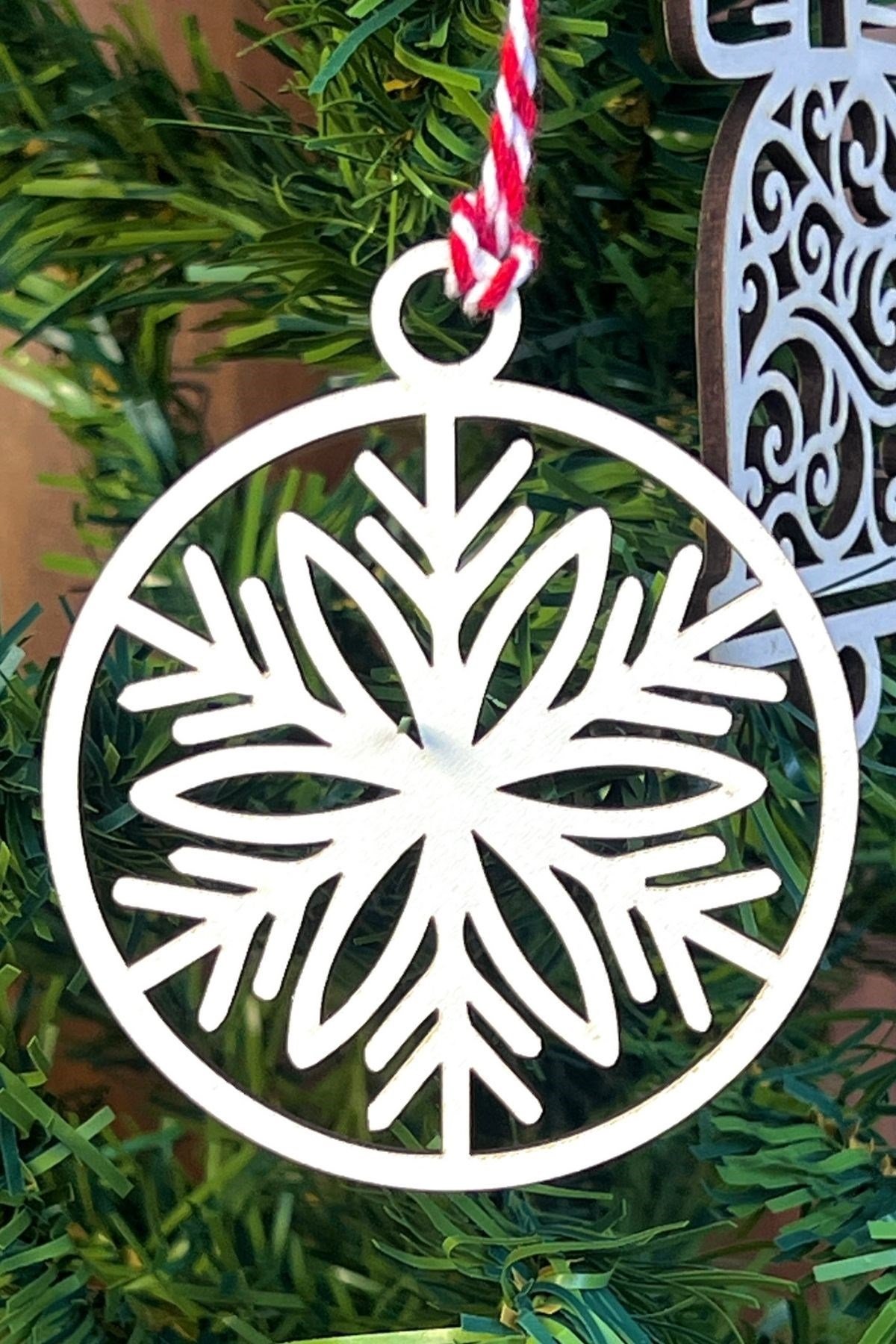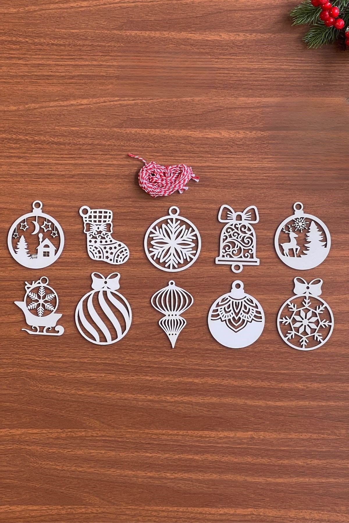 10 Parça Kırmızı Beyaz İpli Karışık Model Ahşap Yılbaşı Ağaç Süsü