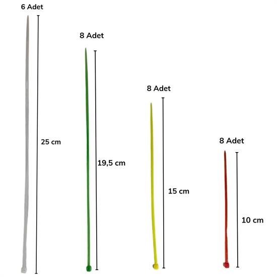Çeşitli Boyutlarda Kelepçeler: Bu set, farklı kablo boyutları ve tipleri için uygun çeşitli plastik kablo kelepçelerini içerir. Bu sayede elektrik, bilgisayar, ev eğlence sistemleri ve daha fazlası için kablolarınızı düzenlemek kolaylaşır.