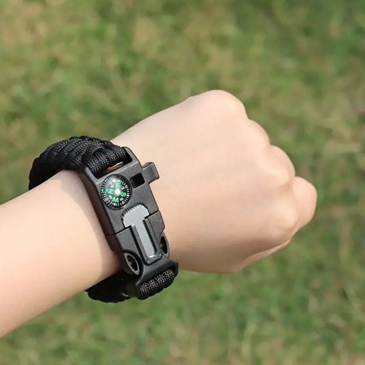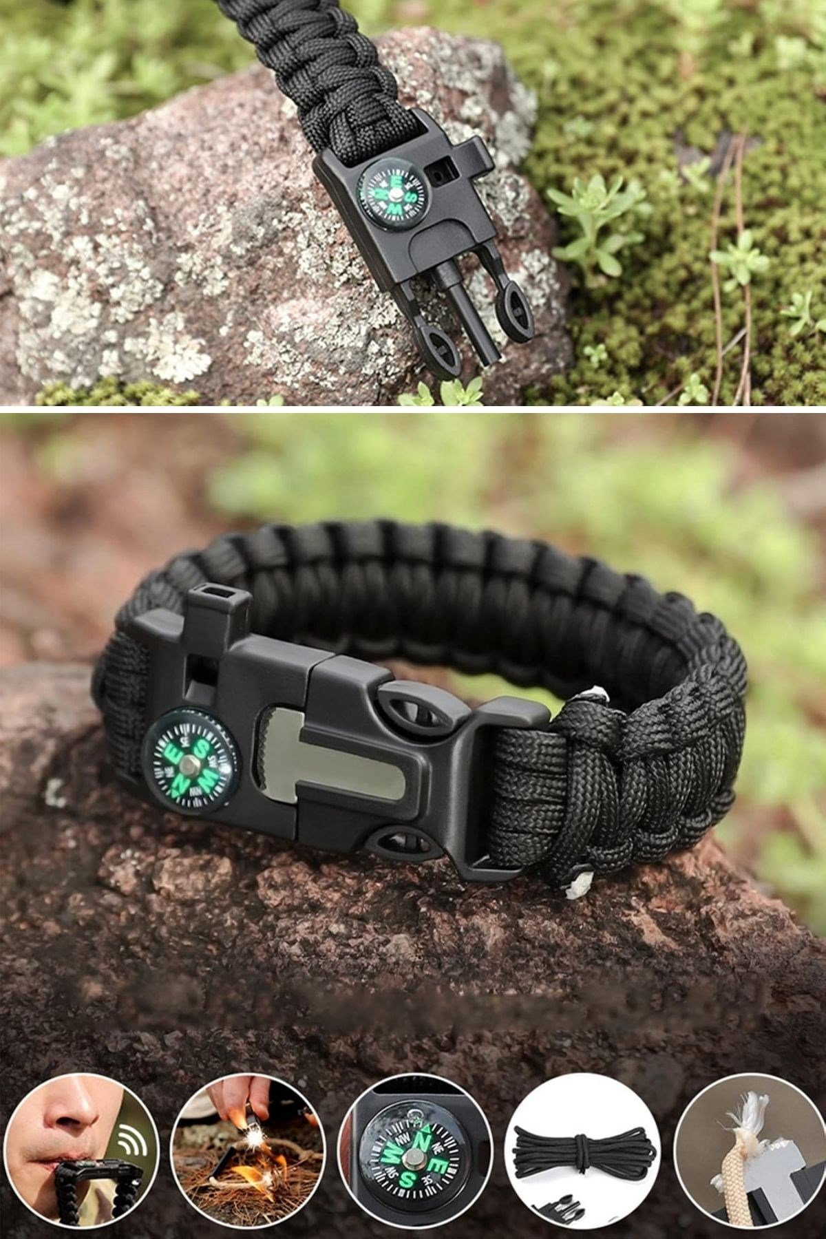 BUFFER® 5’i 1 Arada Çok Fonksiyonlu Hayatta Kalma Bilekliği Pusula, Düdük, Çakmak Taşı ve Şemsiye İpi Bileklik