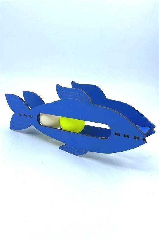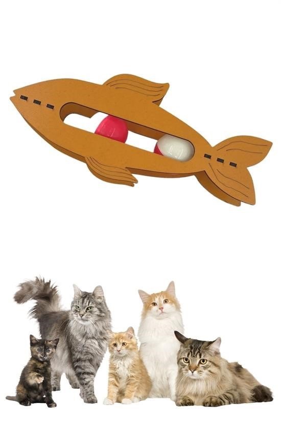 Bu ahşap balık oyuncağının içinde yuvarlanan iki topun sesi kedileri meraklandırır ve dikkatlerini toplar
