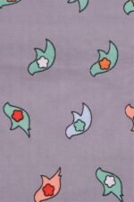 Gri kumaş zemini üzerine renkli kuş baskıları vardır