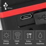 BUFFER® Solar Enerjili USB ile Şarj Edilebilir Ledli Bisiklet Feneri Kornalı ve Su Geçirmez Far